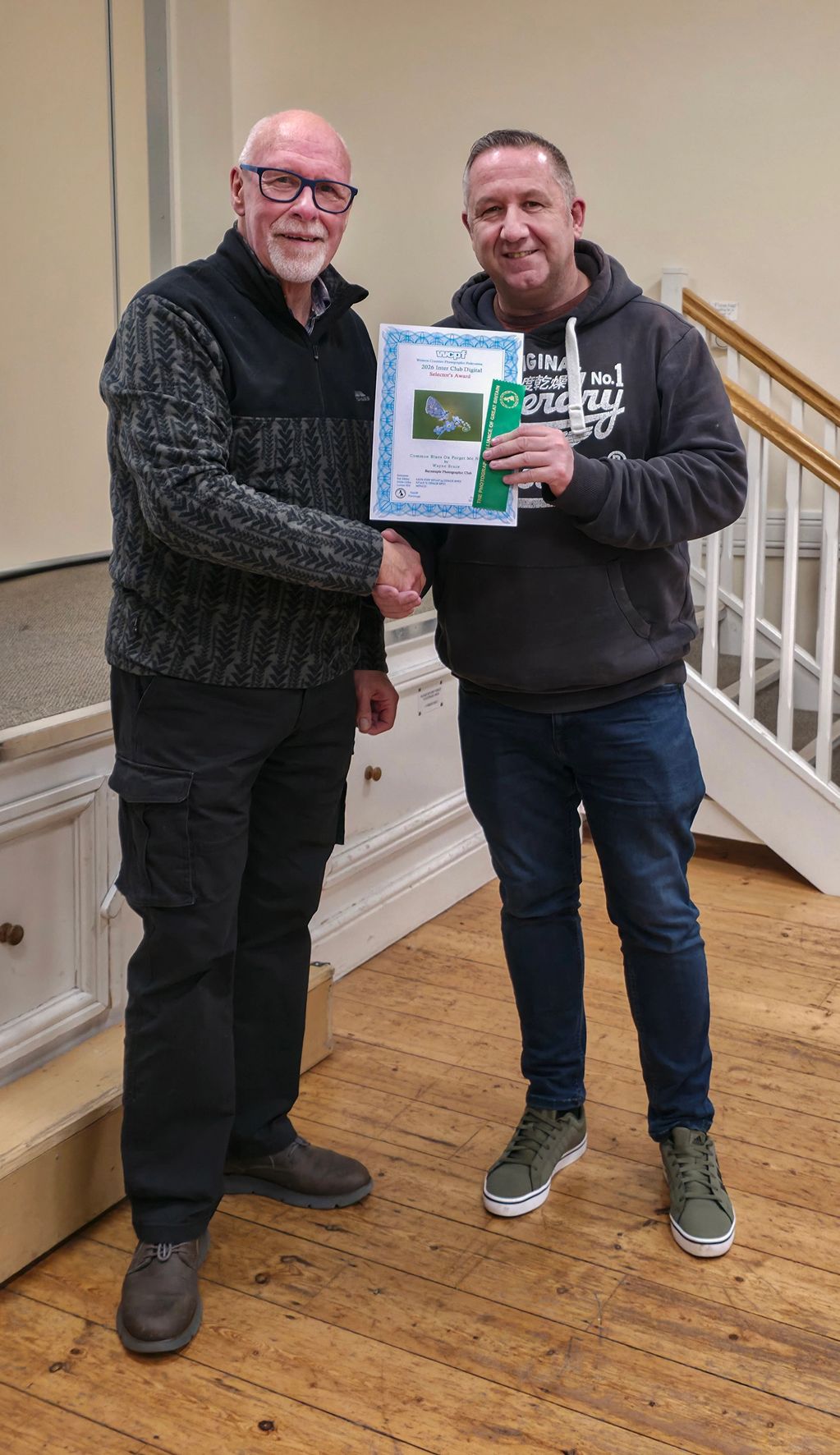 Andy presenting Wayne his Selectors Award & Ribbon for his image "Common Blue on Forget Me Not" which scored a maximum 15 points. Well done Wayne!